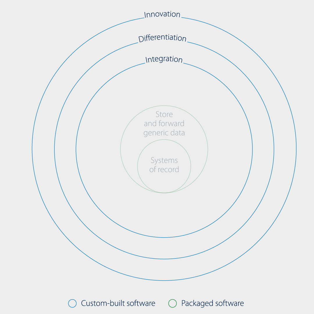 At the ‘core’ of the strategy are assets that are cost-effective, proven, robust and widely used. This is usually where you need dependable and functional packaged software as the building blocks of your architecture.